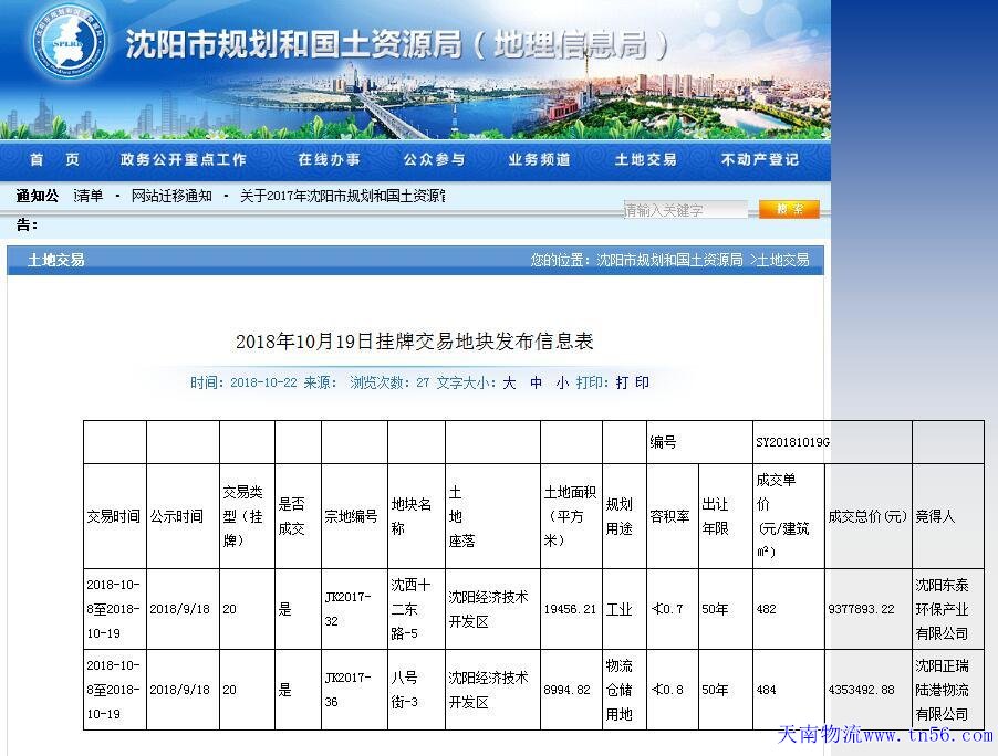 據(jù)沈陽(yáng)市規(guī)劃和國(guó)土資源局10月22日公告,于今年10月8日至10月19日掛牌交易的沈西十二東路-5地塊、八號(hào)街-3地塊已成交,競(jìng)得人分別為沈陽(yáng)東泰環(huán)保產(chǎn)業(yè)有限公司、沈陽(yáng)物流正瑞陸港物流有限公司,總面積約28.45萬(wàn)平,規(guī)劃用途分別為工業(yè)用地、物流倉(cāng)儲(chǔ)用地。